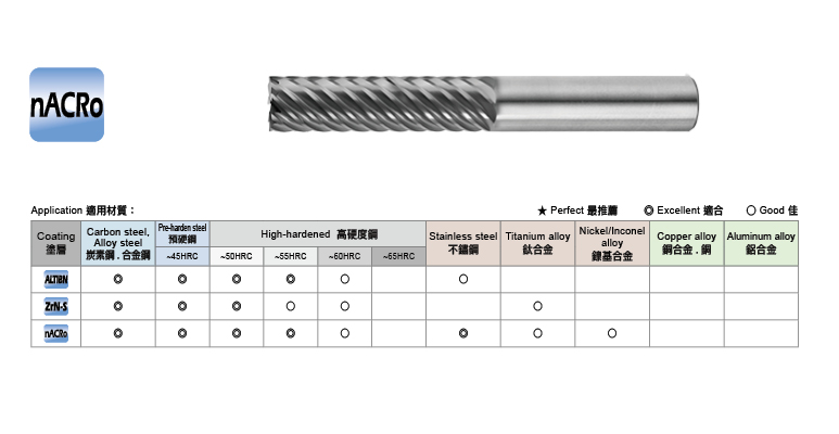 適用材料: ~HRC60/ 鐵材 / 素碳鋼 / 鑄鐵 / 模具鋼 / 合金鋼 / 工具鋼 / 熱處理鋼 / 焊補鋼料